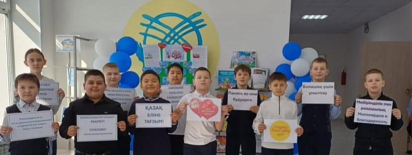Алғыс айту күніне орай мектеп кітапханасы «Адамдарға қуаныш сыйлау үшін мейірімді және сыпайы болу керек» атты ізгілік сағатын өткізді. Балаларды Алғыс айту күнінің тарихымен таныстырып, «алғыс», «ізгілік», «қайырымдылық» ұғымдарының көпқырлылығын ашып көрсетті. Іс-шара барысында қатысушылар қағаз бетіне мүмкіндігінше көп алғыс сөздерін жазды.