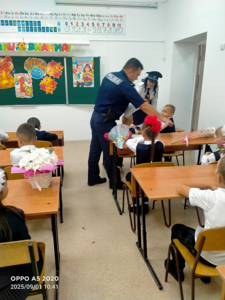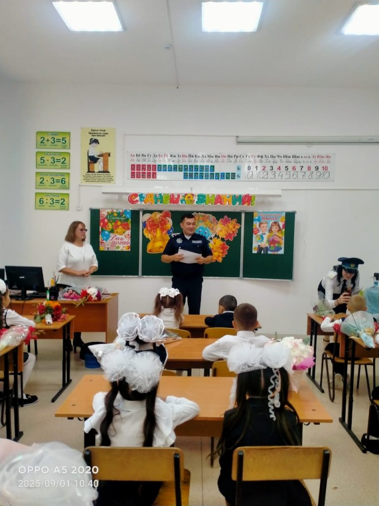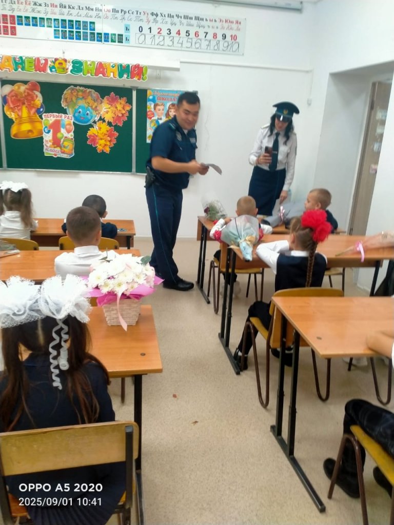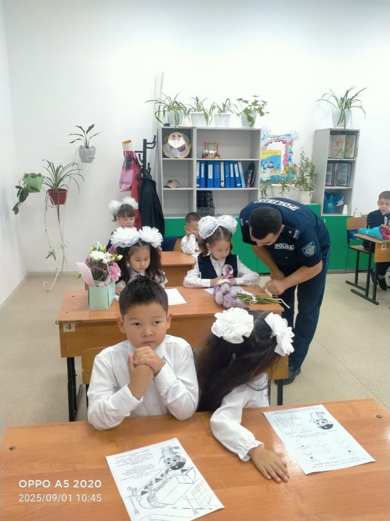 1 қыркүйекте 1-сыныптарда Есіл аудандық полиция бөлімінің өкілдерімен кездесу өтті. Бірінші сынып оқушыларына қонаққа келді: Тюлебергенов Ж. К., Есіл аудандық полиция департаментінің полиция майоры; Исмаилова-Сапарова А.Т., Есіл ӨКП полициясының кіші сержанты, ИВС полицейі. Қонақтар "мектепке Қауіпсіз жол"тақырыбында профилактикалық дәріс өткізді. Сөз сөйлеу барысында полиция қызметкерлері балаларға жол қозғалысы ережелерін еске салып, жолды қалай дұрыс кесіп өту керектігін, әсіресе мұқият болу керектігін түсіндіріп, оқушылардың сұрақтарына жауап берді. Материалды бекіту үшін балаларға ЖҚЕ бойынша тақырыптық бояулар табыс етілді. Іс-шара жанды және танымдық түрде өтті, бірінші сынып оқушылары тақырыпқа белсенді және қызығушылық танытты.
