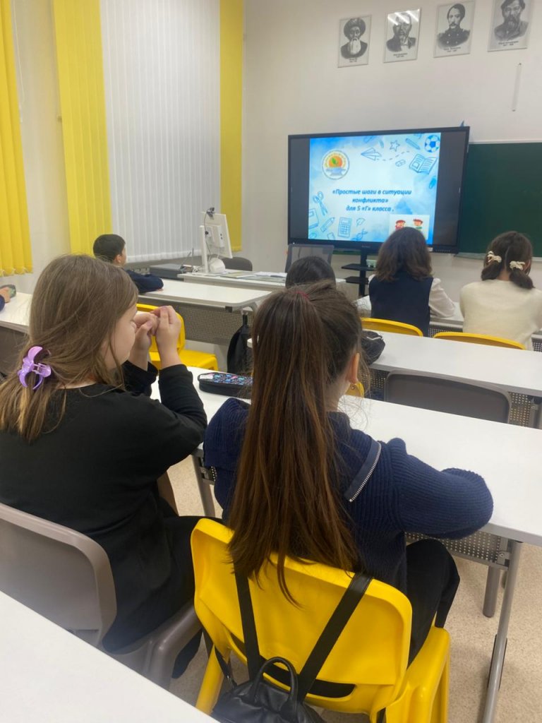 Бүгін 5 «Г» сыныбында «Қақтығысты шешу жолдары» тақырыбында сынып сағаты өтті. Алдымен оқушылар қақтығыс деген не және оны бейбіт жолмен шешудің маңыздылығы туралы танымдық бейнеролик көрді. Содан кейін балалар даулы жағдайлардан шығудың негізгі тәсілдері қарастырылған презентациямен танысты. Одан кейін әр оқушыға қақтығыс жағдайы жазылған қағаз таратылып, олар өздерінің қақтығысты шешу бойынша мүмкін нұсқаларын жазды. Оқушылар белсенді қатысты, өз идеяларын ұсынды, түрлі жағдайларды талқылады және күрделі мәселелерден бейбіт, сыйластықпен шығудың жолдарын үйренді.