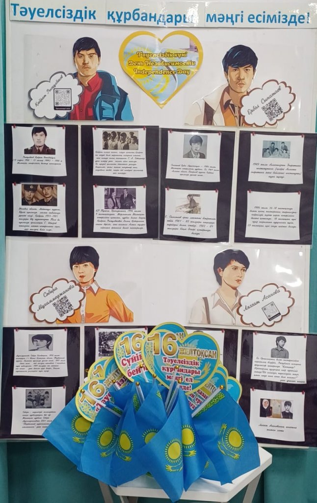 «Тәуелсіздік - Ұлы дала ұрпақтарына аманат» Қазақстан Республикасының Тәуелсіздік күні – Қазақстан Республикасының негізгі ұлттық мерекесі. Бұл күнді еліміз әр жыл сайын 16 желтоқсан күні атап өтеді. 1991 жылы 16 желтоқсанда Қазақстанның Республикасының Жоғарғы Кеңесі шешіммен ҚР тәуелсіздігі мен егеменділігі туралы заңды қабылдады. 16 желтоқсан Тәуелсіздік күніне орай мектебіміздің 7»А»,8»А» және 9»А» сынып оқушылары арасында «Тәуелсіздік –еліміздің ерлік жолы» тақырыбында викториналық ойын өтті. Мақсаты: өз елін сүюге, қадірлеуге, осы елдің ұланы екенін мақтан етуге, Отаншылдыққа, елжандылыққа, Отанына адал қызмет етуге тәрбиелеу.