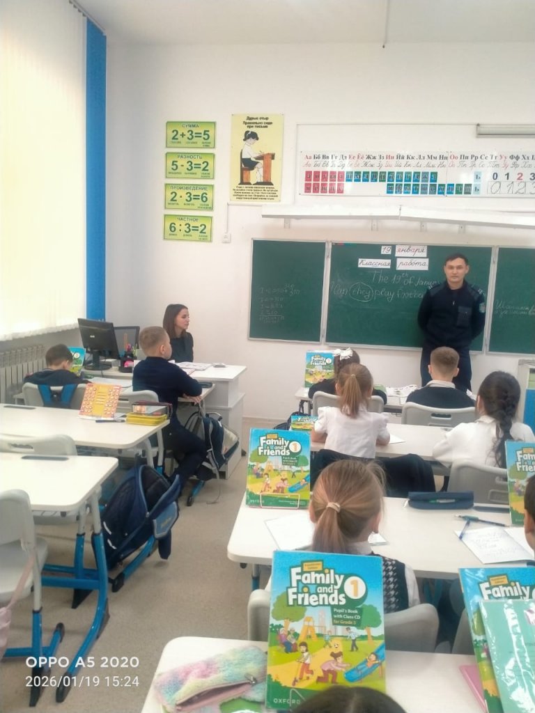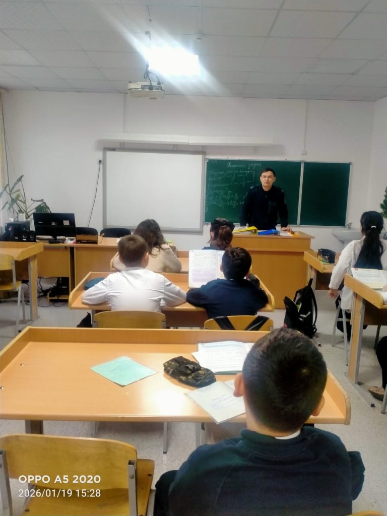 2026 жылғы 19 қаңтарда мектепте «Заң және тәртіп» айлығы аясында бастауыш және орта буын оқушылары арасында полиция лейтенанты Шаймерден Р. М.-ның қатысуымен «Заң мамандықтары» атты профилактикалық-танымдық іс-шара өткізілді. Кездесу барысында оқушылар ішкі істер органдарындағы қызметтің ерекшеліктерімен танысып, полиция қызметкерлерінің кәсіби міндеттері, жеке қасиеттеріне қойылатын талаптар және заңды сақтау жауапкершілігі туралы мағлұмат алды. Полиция лейтенанты Шаймерден Р. М. қоғамдағы құқықтық тәртіптің маңызы туралы айтып, қызметтік тәжірибесінен мысалдар келтіріп, оқушылардың сұрақтарына жауап берді. Аталған іс-шара оқушылардың құқықтық мәдениетін қалыптастыруға, заңға деген құрметін арттыруға және болашақ мамандықты саналы түрде таңдауға ықпал етті.